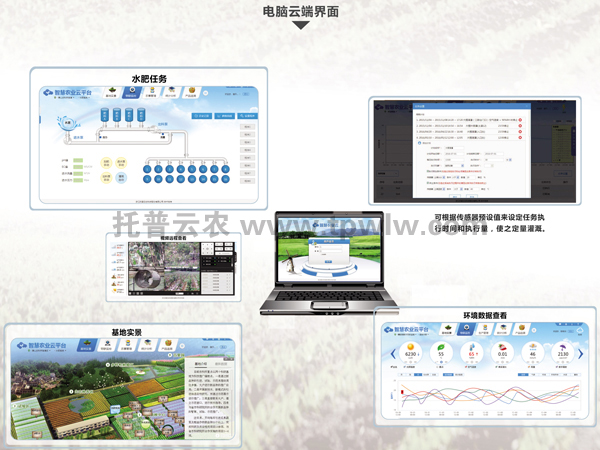 ?????? 基地安裝的托普云農(nóng)的溫室小管家、空氣溫濕度、光照強度、二氧化碳、土壤溫濕度、智能水肥裝置、視頻監(jiān)控系統(tǒng)等智能硬件可遠程在線實時采集溫室環(huán)境信息,上傳至托普智慧農(nóng)業(yè)云平臺,在管理平臺設(shè)置環(huán)境上下限值即可實現(xiàn)預(yù)警,定制的托普智慧農(nóng)業(yè)管理平臺通過手機或電腦可遠程自動開啟相關(guān)的通風(fēng)、濕簾、灌溉等設(shè)備,查看環(huán)境數(shù)據(jù)、視頻信息、遠程進行專家咨詢、查看作物生長情況、設(shè)備運行狀況、園區(qū)安防情況等。實現(xiàn)溫室大棚的信息化、智能化、簡約化管理。真正做到手機、電腦在手,管理無憂。