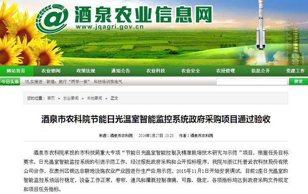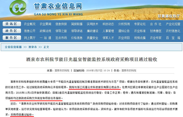 酒泉市農(nóng)科院節(jié)能日光溫室智能監(jiān)控系統(tǒng)政府采購項目通過驗收
