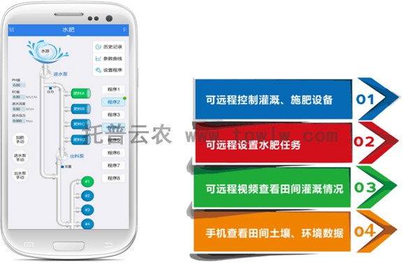 大蔥定植后,肥水管理是高產、優質的重要環節。托普云農水肥一體化自動控制系統可根據監測的土壤水分、作物種類的需肥規律,設置周期性水肥計劃實施輪灌。用戶可通過施肥機設置灌溉量、肥液濃度、酸堿度等水肥過程的重要參數,也可通過電腦或手機APP遠程設置相應參數進行灌溉施肥,從而實現對灌溉、施肥的定時、定量控制,充分提高水肥利用率。