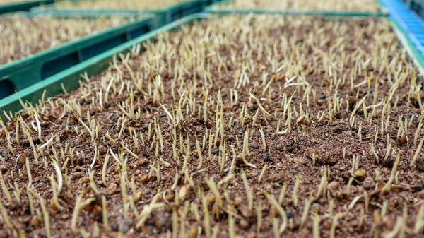 在育秧工廠內(nèi),一條機械化流水線設施貫穿車間,車間工人只需要將催芽框放置在履帶之上,即可實現(xiàn)自動填土、播種、藥劑消毒等一系列操作,隨后用平板車將催芽框轉移至恒溫恒濕培養(yǎng)室,靜待數(shù)日,即可得到生機盎然的新生嫩芽。
