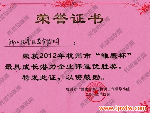 應杭州市科學技術委員會邀請,昨日下午于浙江省廣電總局演播室,公司總經理陳渝陽參加了“2012年杭州市‘雛鷹杯’最具成長潛力企業“評選總決賽及頒獎典禮。浙江托普儀器有限公司榮獲“雛鷹杯”最具成長潛力企業12強殊榮。