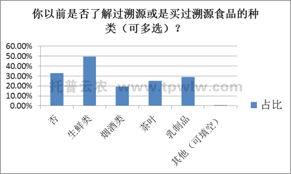 目前,市場上出現了較多種類的溯源食品,例如生鮮類、乳制品類、茶葉類、煙酒類等。在此次調查中,有約68%的人表示了解或購買過溯源食品。近50%的人購買過生鮮類溯源食品,少數人購買過乳制品、煙酒、茶葉等溯源食品。66%:食物的生產加工過程備受關注