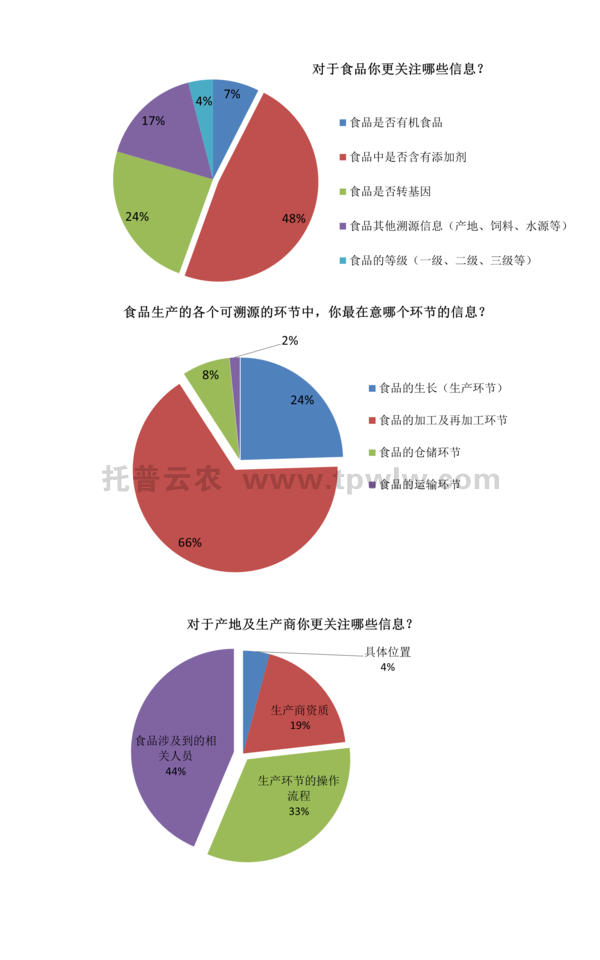 除此之外,也有不少人表示對食物生長信息比較在意。食品中是否含有添加劑、是否轉基因等信息也是人們關注的重點。對于食品生產地和生產商,人們更關注生產(生長)環節的操作流程和食品涉及到的相關人員的信息。