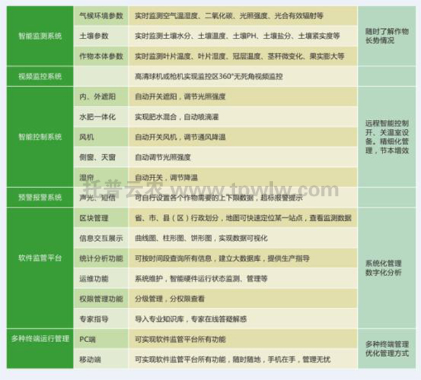 智能農(nóng)業(yè)溫室大棚,可實時無線采集和傳輸溫室大棚內(nèi)的溫度、濕度、光照、土壤溫濕度、CO2濃度、葉面濕度、露點溫度等環(huán)境參數(shù),通過PC電腦、移動手機和平板電腦以直觀的圖表和曲線的方式顯示給用戶,并根據(jù)種植作物的需求提供各種聲光報警信息。它主要由農(nóng)業(yè)溫室大棚、智慧農(nóng)業(yè)溫室大棚信息展示屏、各種無線傳感器、控制器及系統(tǒng)軟件等組成。