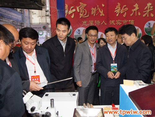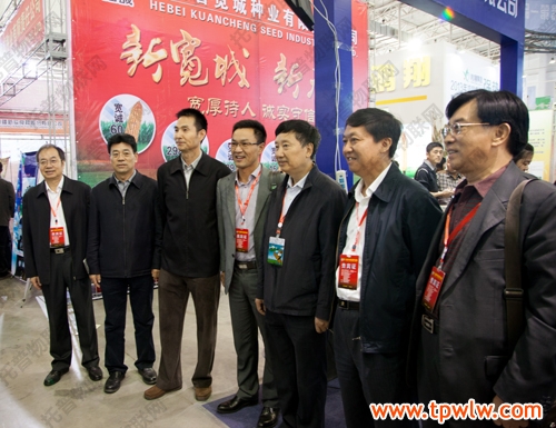圖為:托普總經理陳渝陽先生引領農業部種子管理局張延秋局長(右二),吉林農委李國強主任,全國農技推廣服務中心黨委杭大鵬(右四)書記等領導參觀公司展臺