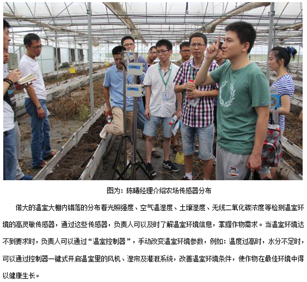 喬司農(nóng)場(chǎng)是浙江省首家集規(guī)模種植、科研生產(chǎn)、網(wǎng)絡(luò)銷售、宅配服務(wù)為一體的國(guó)家級(jí)農(nóng)業(yè)綜合開發(fā)綠色蔬菜生產(chǎn)基地。2014年4月中旬,托普物聯(lián)網(wǎng)系統(tǒng)在喬司農(nóng)場(chǎng)成功搭建運(yùn)行。 隨后的8月2日,銷售部全體員工在時(shí)任營(yíng)銷經(jīng)理陳曦的帶領(lǐng)下前往喬司農(nóng)場(chǎng),觀看農(nóng)場(chǎng)內(nèi)的物聯(lián)網(wǎng)系統(tǒng)運(yùn)行情況。