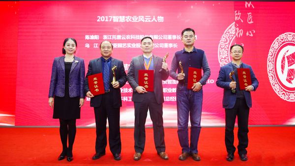 圖:托普云農(nóng)副總經(jīng)理朱旭華(右一)代陳渝陽董事長上臺領(lǐng)取2017智慧農(nóng)業(yè)風(fēng)云人物