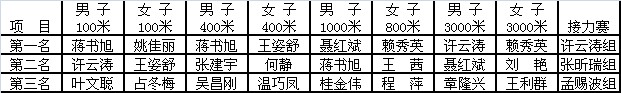 此次田徑運動會分為男子100米、女子100米;男子400米,女子400米;男子1000米,女子800米;男子3000米,女子3000米;男女混合4*200米接力賽。賽制為,初賽?。拷M取前兩名和成績最好的兩名共六名人員進入決賽)前三名進入決賽,決賽取前三名為獲獎選手。上午9:10,運動會在女子400米初賽中拉開帷幕。