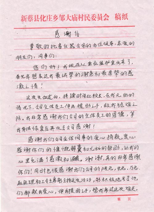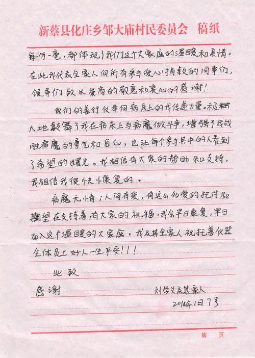 1月15日,公司收到劉學義寫來的信,信中他告訴托普家人他的病情已好轉,術后已由重癥監護室轉入普通病房,等待觀察與休養。長長的一封信,給同事們帶來了喜悅的消息,也傾訴著他對托普家人的深深謝意!