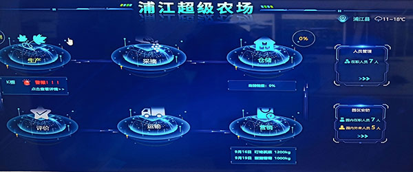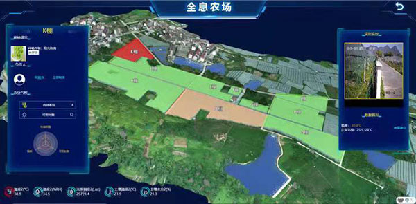 作為智慧農業的升級版本,“超級農場”項目對生產經營管理等每一個環節,都進行了嚴格的監管,數據采集,實時監測。通過無人機的航拍,實現了對整個農場的3D建模,把整個農場分成A—K,差不多11個區塊,然后進行區塊的數字化監控。一塊電子顯示屏就可看到農場的所有狀況,葡萄園11個鋼架大棚所有環境信息,包括溫度、濕度、土壤酸堿值、光照等情況都呈現在屏幕上。另外,葡萄園里各處分布了多少攝像頭,有多少在職人員,多少外來人員,也都能一目了然。