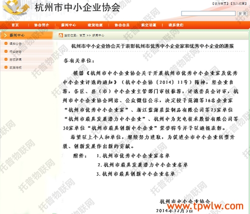 根據《杭州市中小企業協會關于開展杭州市優秀中小企業家及優秀中小企業評選的通知》(杭中小企協〔2014〕11號)精神,經企業自薦,各區、縣(市)中小企業主管部門審核推薦,評選委員會評審,杭州市中小企業協會網站、公眾微信公示,決定授予范淵等16名企業家“杭州市優秀中小企業家”、浙江藍海星鹽制品有限公司等25家單位“杭州市最具發展潛力中小企業”、杭州中為光電技術股份有限公司等30家單位“杭州市最具創新中小企業”榮譽稱號并予以通報表彰。