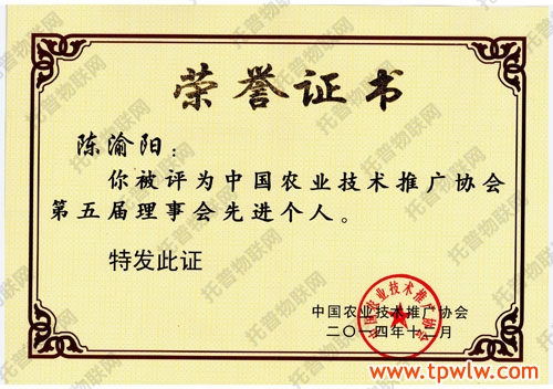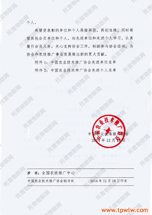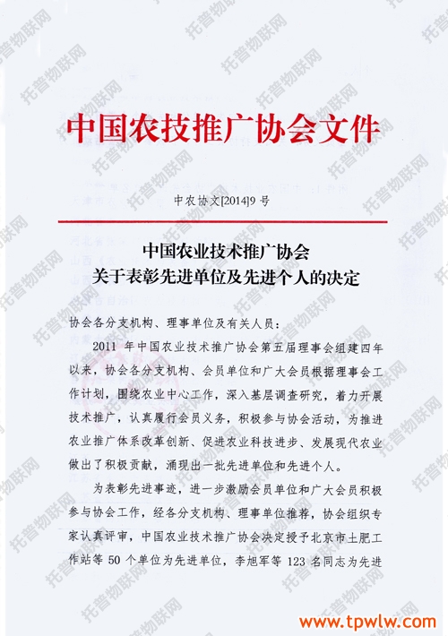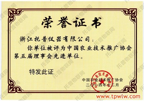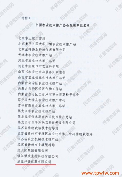經逐級推薦及專家評審,在“中國農業技術推廣協會關于表彰先進單位及個人的決定”中,托普儀器被評為“中國農業技術推廣協會第五屆理事會先進單位”,同時,公司陳渝陽總經理也被評為“中國農業技術推廣協會第五屆理事會先進個人”。