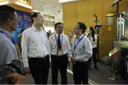 圖為:余欣榮副部長和王小兵副司長一行蒞臨托普展區?