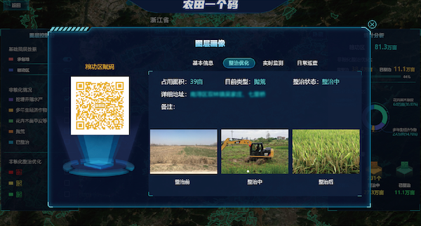 構建“一田一碼”,對農田地塊進行賦碼,以“農田碼”貫穿規劃選址、竣工驗收、項目管護、農田種植等全過程數據,構建“碼上監管”"碼上服務”等業務場景,實現全周期串聯,清晰掌提高標準農田建設全空間、全要素、全過程信息,做到“事前事中可預警”“全程信息可追溯”。