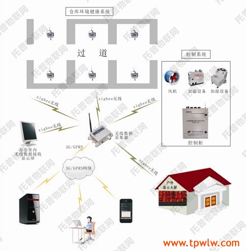 主要由環境溫/濕度、二氧化碳等傳感器組成,配合無線數據采集器及傳輸模塊將數據傳回給平臺,主要實現對倉庫環境參數的在線采集、處理。