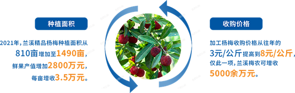 2021年,蘭溪精品楊梅種植面積從810畝增加至1490畝,鮮果產值增加2800萬元,每畝增收3.5萬元。加工楊梅收購價格從往年的3元/公斤提高到8元/公斤,僅此一項,蘭溪梅農可增收5000余萬元。