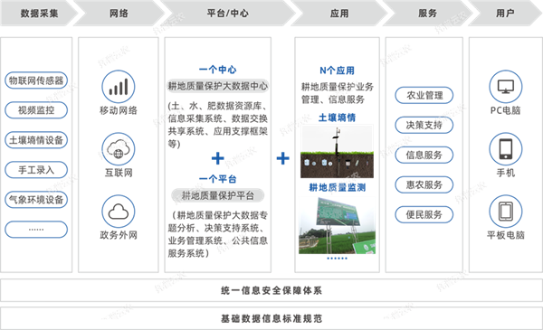 利用“1+1+N”模式,通過信息技術,構建標準化、規范化的耕地質量管理信息系統,構建一個耕地質量保護大數據中心,一個耕地質量保護大數據平臺和N個業務子系統。