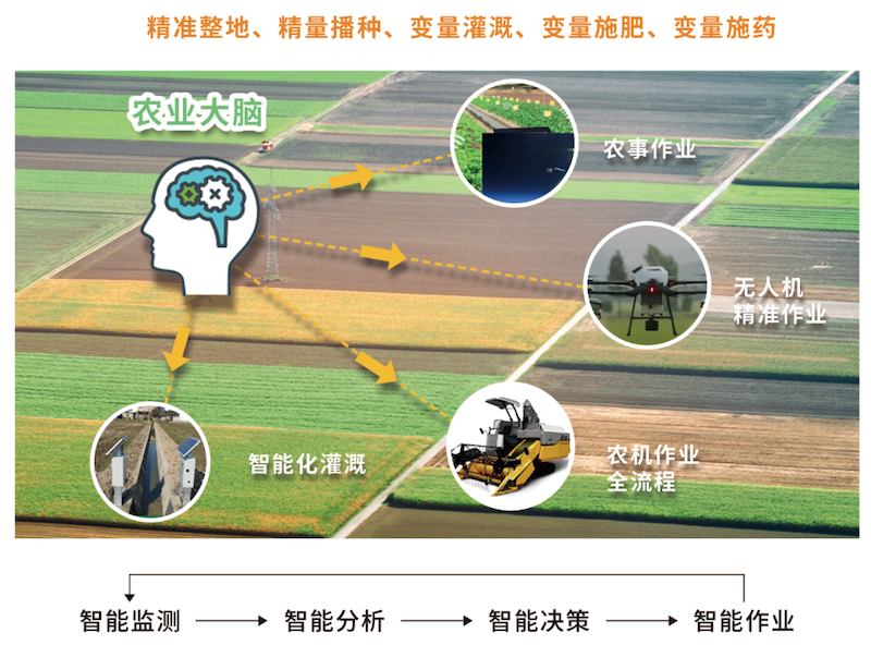 以北斗衛星導航技術為基礎,結合智能農事建議,聯動智能裝備,實現大田生產全程作業機械化、管理可視化,農場無人化。