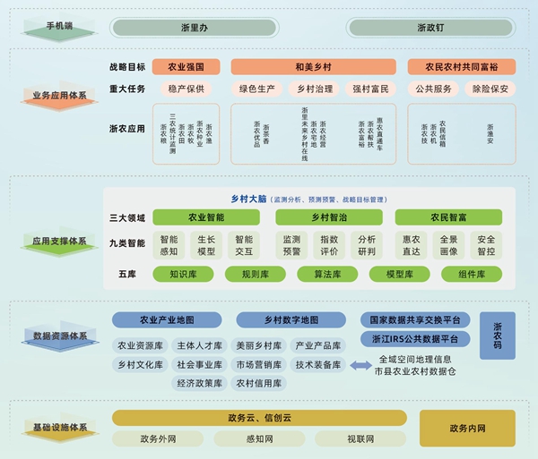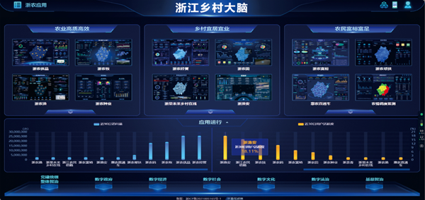 浙江省農業農村廳圍繞省委數字化改革決策部署,聚焦大腦監測分析評價、預測預警和戰略目標管理能力的新目標,大力推進"浙江鄉村大腦 +浙農系列應用"體系建設,迭代形成以"11153"核心構架為支撐的"浙江鄉村大腦"(1個數據倉,1張全域地理信息圖,1個"浙農碼”,5個庫為知識庫、規則庫、算法庫、模型庫和組件庫,3領域能力為農業智能、鄉村智治、農民智富),按照'一表一圖N清單"的方法,開發建設9個智能模塊,以數字技術助力農業農村現代化、鄉村振興和農民農村共同富裕。目前,"浙江鄉村大腦"已實現省市縣三級貫通。